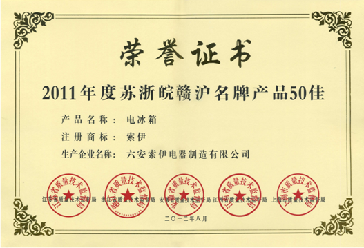 8月31日,2012年全國質量月活動啟動儀式暨首屆安徽省政府質量獎頒獎活動在安徽省人民政府大禮堂隆重舉行。   經過專家評審,社會評議最終審定出“索伊”牌電冰箱榮獲“2011年度蘇浙皖贛滬名牌產品五十佳”榮譽稱號。據了解...